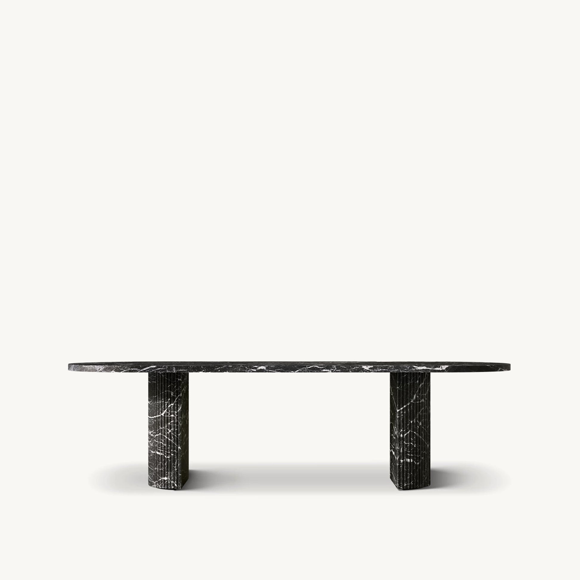 This stunning black dining table is crafted from premium black marble with striking white veining, making it a luxurious addition to any modern dining room. The minimalist design features a sleek oval top and fluted pedestal legs, ensuring both style and stability. Perfect for family meals or dinner parties, it pairs beautifully with contemporary chairs, chic lighting fixtures, and elegant tableware. Its sophisticated look enhances open-plan living areas, creating a cohesive and inviting space. With its high-quality material and timeless design, this black dining table is a must-have for any stylish home.