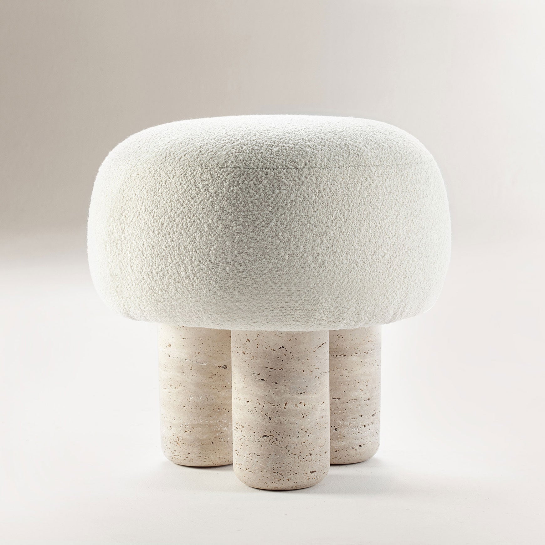 A unique addition to modern interior design, the Hyge Modern Stool features plush Boucle Ivory fabric upholstery atop striking Travertine legs. Inspired by contemporary Portugal architecture, it pays tribute to Romanesque heritage with its elegant arches and classic geometries.