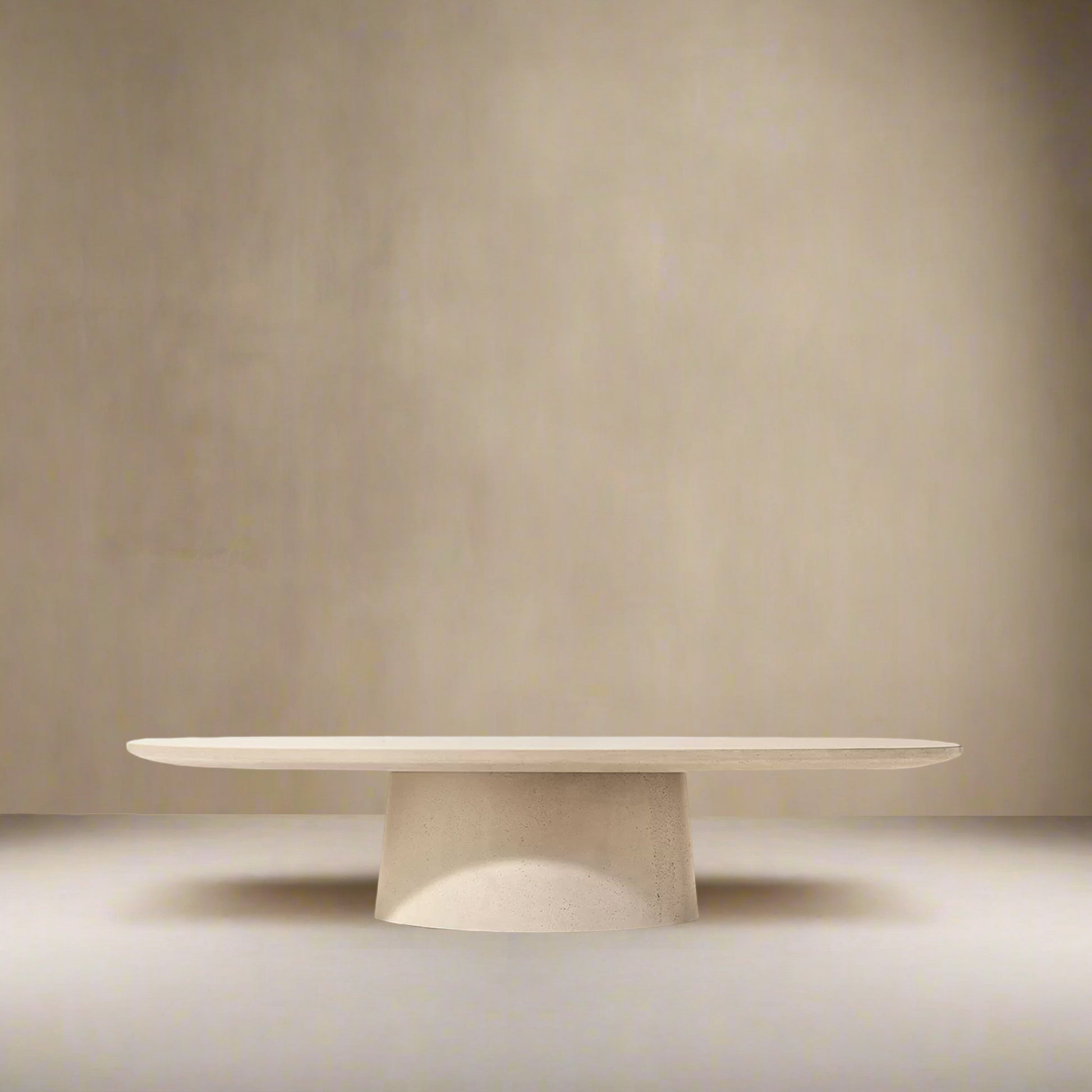 This Modern Coffee Table, hand-molded from concrete, showcases a sleek minimalist design with a smooth, oval shape tabletop and a tapered pedestal base. Perfect for both indoor and outdoor spaces, its neutral tone easily blends with various decor styles, complementing sofas, rugs, and accent chairs. Whether as the centerpiece in a living room or a stylish addition to a patio, this versatile piece offers practicality and aesthetic appeal. Its contemporary design makes it ideal for modern homes while staying functional for everyday use. Truly, a modern coffee table that brings timeless style wherever you place it.