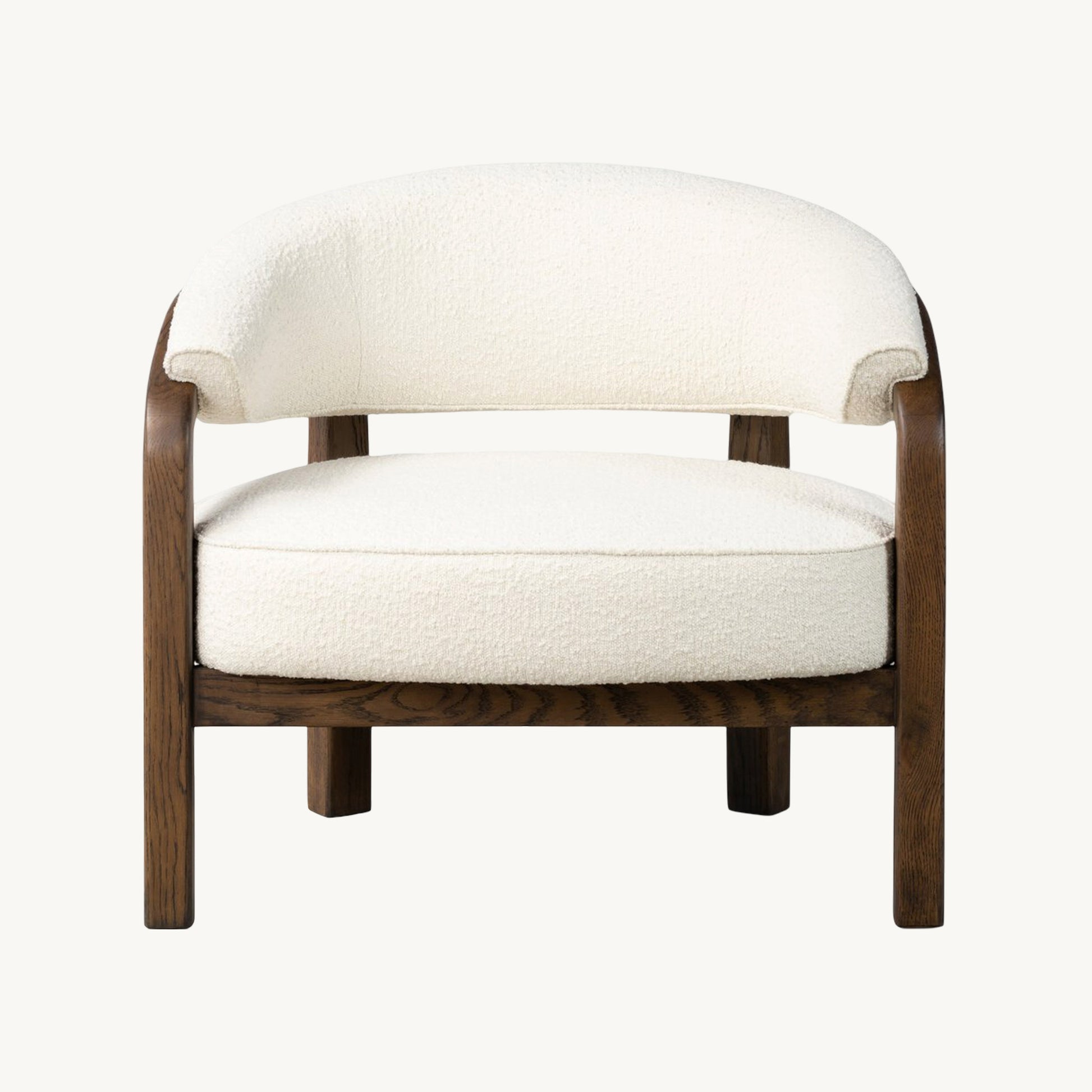 Elevate your home with the Oak Chair, a striking blend of timeless craftsmanship and modern design. The Oak Chair features an exposed wood frame with a rich dark finish artfully cradling the plush seat and back cushions. Its fluid frame flows seamlessly from the floor to the curved upholstered backrest creating a sense of movement and elegance. With integrated armrests and off-white cushions, it offers unmatched comfort and visual appeal. Ideal to pair with a rustic wooden table or minimalist decor for a balanced aesthetic. Whether for living room , bedroom or foyer, the Oak Chair delivers a sophisticated yet relaxed vibe, effortlessly fitting into any interior design setting.
