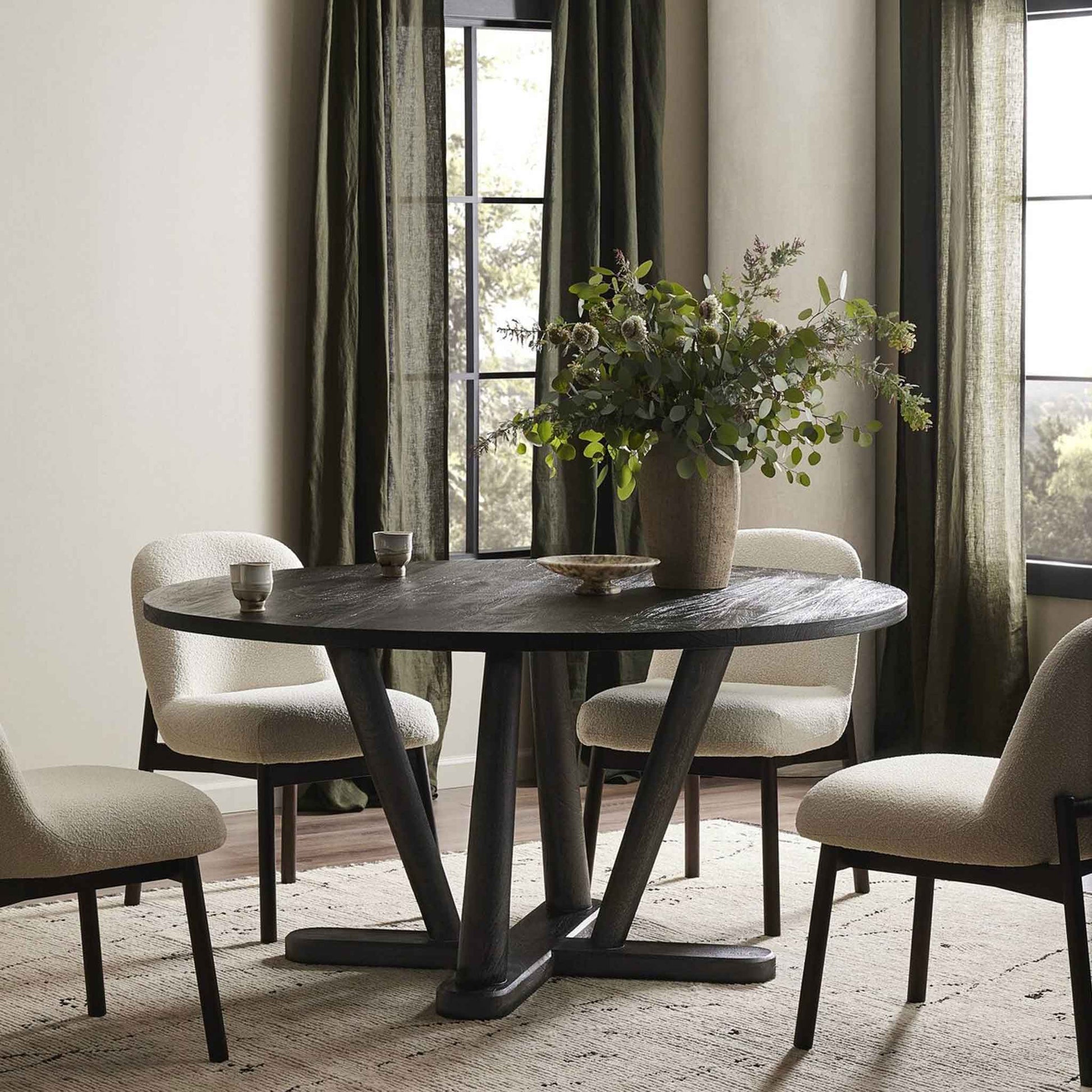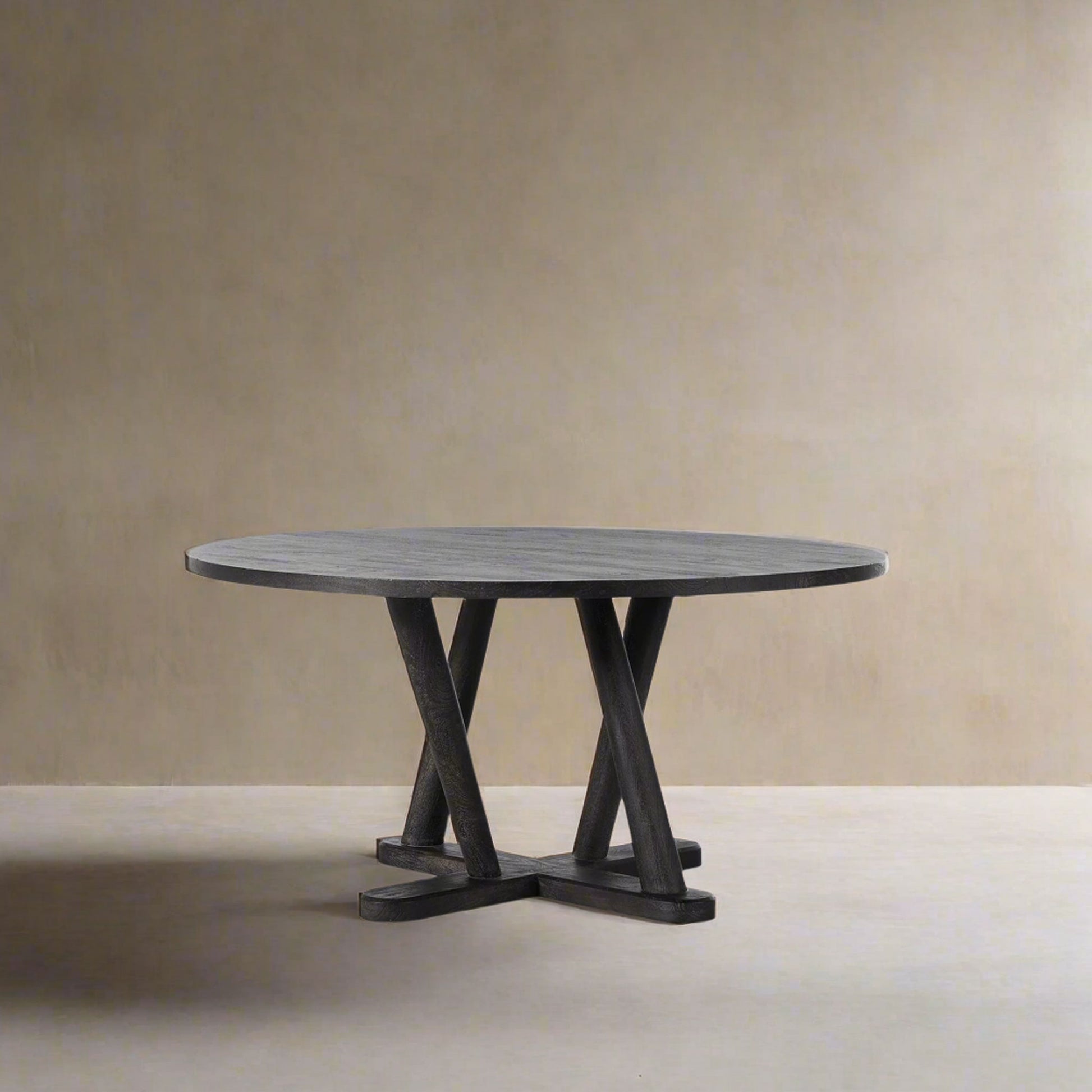 The Round Wood Table is crafted from high-quality dark wood, featuring a chic black finish and unique crisscross leg design. Ideal for family gatherings or entertaining guests, it comfortably seats up to six people. Pair this dining table with matching wooden chairs or mix and match with contemporary seating for a chic look. The Round Wood Table adds a natural elegance and functionality to any home, blending seamlessly with various decor styles, from modern to rustic.